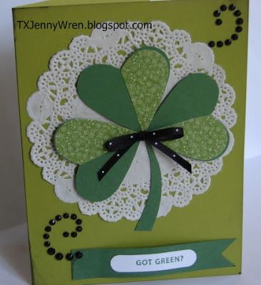I also used some black rhinestones in a swirl at each corner of my card, along with the garden green banner that has the sentiment "Got Green?" stamped on it with garden green ink.