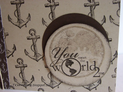 The sentiment is from WORD PLAY. I LOVE this set and it has so many different sayings on it - a real go to when it comes to sentiments. I punched out the early espresso circle and the saying and the stamped world with the 2 1/2" circle punch.
