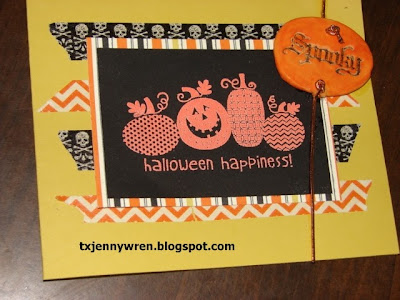 The added BLING is the clay embellishment.  Isn't it awesome??!!  I added a few drops of pumpkin pie to the stampin pressed clay, then I inked up the sentiment SPOOKY in black ink and pressed it down into the clay.  I let it dry and it was too light in color for me.  So I used my marker to color over the pumpkin pie clay again.  I used a bronze piece of stretch cord to attach it to my card.  What do you think of this NEW TECHNIQUE I invented?  This clay is amazing and in the next few days I will be showing other things I have done with it.
