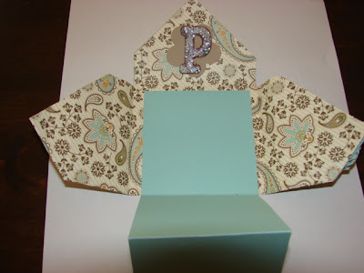 WITH THE BELLY BAND OFF AND THE TOP OPENED FROM THE SQUARE POCKET, YOU SEE MY FIRST SURPRISE - I USED A CHIPBOARD LETTER "P" ON TOP OF A FLOWER PUNCH OUT OF CRUMB CAKE CARD STOCK. I USED HEAT AND STICK POWDER AND BAJA BLUE GLASS GLITTER TO BLING UP THE LETTER. YOU GET A PEEK OF THE POOL PARTY BLUE CARD STOCK INSIDE...