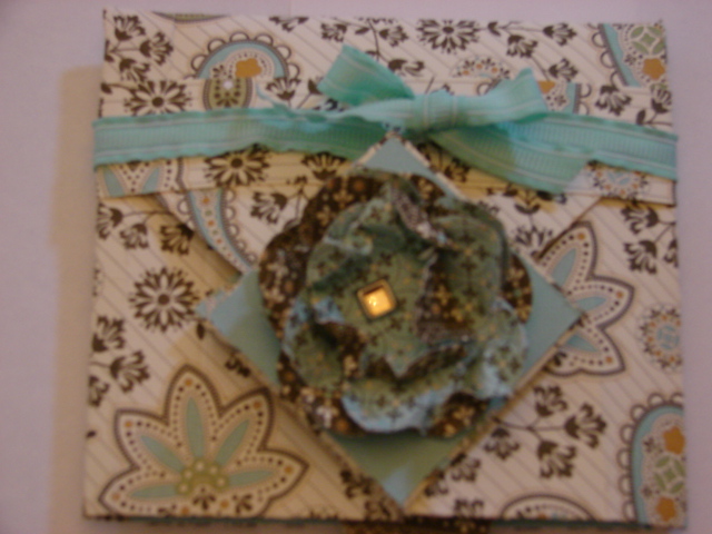 HERE IS A CLOSER VIEW SO YOU CAN SEE THE CUTE SQUARE IN THE FRONT THAT FORMS FROM THE FOLDING OF THE DSP. I MADE A FLOWER OF 5 PUNCHES WITH THE BLOSSOM PUNCH AND A FIRE RHINESTONE BRAD IN THE MIDDLE OF THE FLOWER. I SCRUNCHED UP THE PUNCHES AND THEN CONNECTED THEM WITH THE BRAD. ISN'T IT CUTE? I LOVE THIS PAPER - SPICE CAKE. LET'S OPEN IT UP: