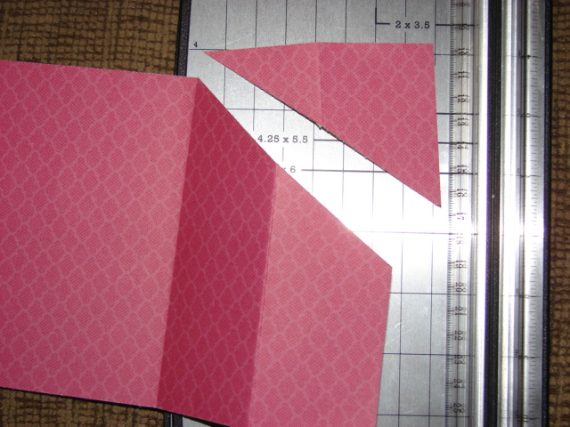 THIS IS THE BACK SIDE OF MY DSP. THIS SIDE IS JUST AS PRETTY, ISN'T IT? FROM THE 4" SCORE LINE DIAGONALLY TO THE MARK WE PUT ON EACH SIDE, YOU CUT OFF THE TRIANGLE IT CREATES WITH YOUR
