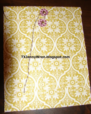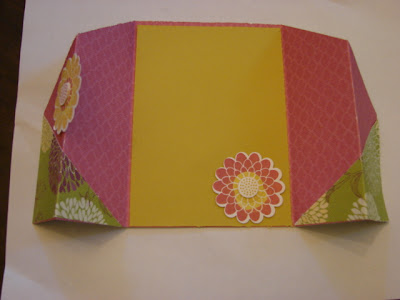 NOW CUT A PIECE OF MATCHING DSP ABOUT 1 3/4" TO 2" WIDE BY THE LENGTH OF THE ENVELOPE. PUT A SCORE LINE AT 3/4" AND FOLD. PUT GOOD GLUE ON THE BACK OF THE SMALLER PIECE AND SLIDE IT INTO THE ENVELOPE TO ADHERE. THIS WILL BE THE DECORATED FLAP.